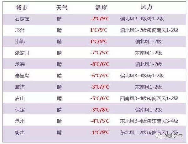 今天白天全省晴间多云,大部地区最高气温变幅不大,北部地区设区市(张家口、承德、唐山、秦皇岛)最高气温为2℃至6℃,中南部地区各设区市为6℃至10℃,气温依然较低,请注意保暖。