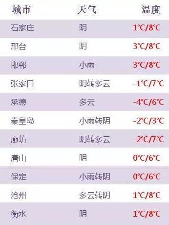 今天白天,全省阴,保定、廊坊以南地区有小雨或零星小雨,其中保定西部和石家庄西部有小雨或零星雨夹雪。
