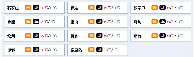 今天,河北大部地区最高气温继续上升,北部地区设区市(张家口、承德、唐山、秦皇岛)最高气温为21℃至27℃,中南部地区各设区市为26℃至30℃。