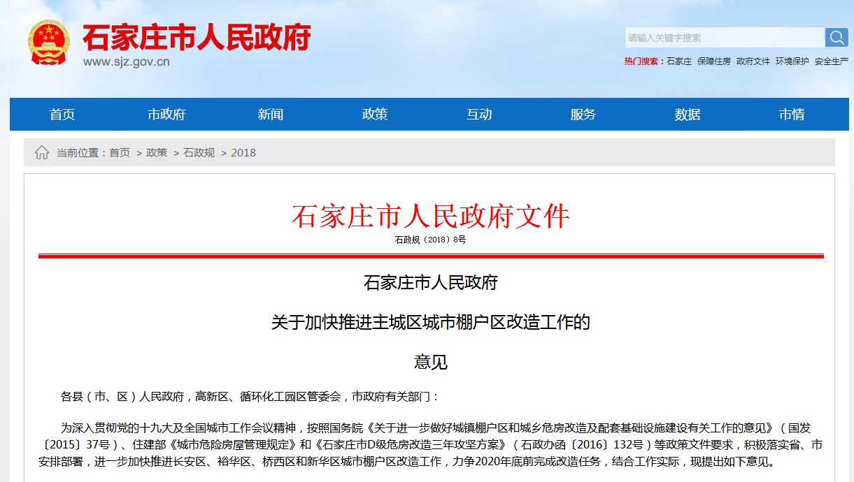 导语:近日,石家庄市人民政府网站上发布了《石家庄市人民政府关于加快推进主城区城市棚户区改造工作的意见》(以下简称《意见》),进一步加快推进长安区、裕华区、桥西区和新华区城市棚户区改造工作,力争2020年底前基本完成主城区现有城市棚户区改造,重点是国有土地上的C、D级危房改造,消除人民群众居住安全隐患。