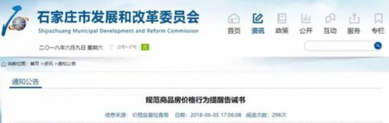 6、近日,石家庄市发展和改革委员会发布《规范商品房价格行为提醒告诫书》,对石家庄市商品房市场价格行为做出规范。对于有价格欺诈行为的,捏造、散布虚假涨价信息、利用其它手段哄抬价格、扰乱市场价格秩序等不正当价格行为的,处以最高50万元的罚款。