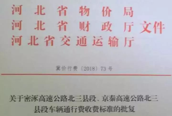 根据省政府办公厅《关于同意密涿高速公路廊坊至北三县(三河)段设置收费站的复函》(冀政办字(2016)138号)、《关于同意密涿支线高速公路诸葛店至段甲岭段设置收费站的复函》(办字(2011)151号)和《关于同意北京至秦皇岛高速公路河北省京冀、冀津连接线段设置收费站的复函》(冀政办字(2017)111号)批复,经研究,现将密涿高速公路北三县段、京秦高速公路北三县段车辆通行费收费标准等相关事项批复如下:
