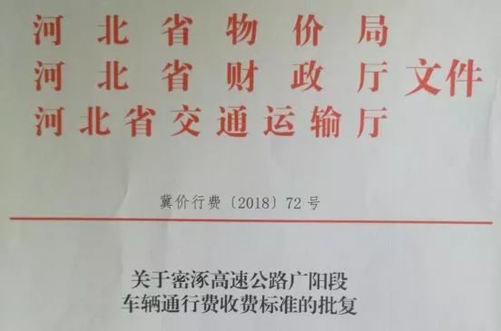 根据省政府办公厅《关于同意密涿高速公路廊坊至北三县(三河)段设置收费站的复函》(冀政办字(2016) 138号)批复,经研究,现将密涿高速公路广阳段车辆通行费收费标准等相关事项批复如下: