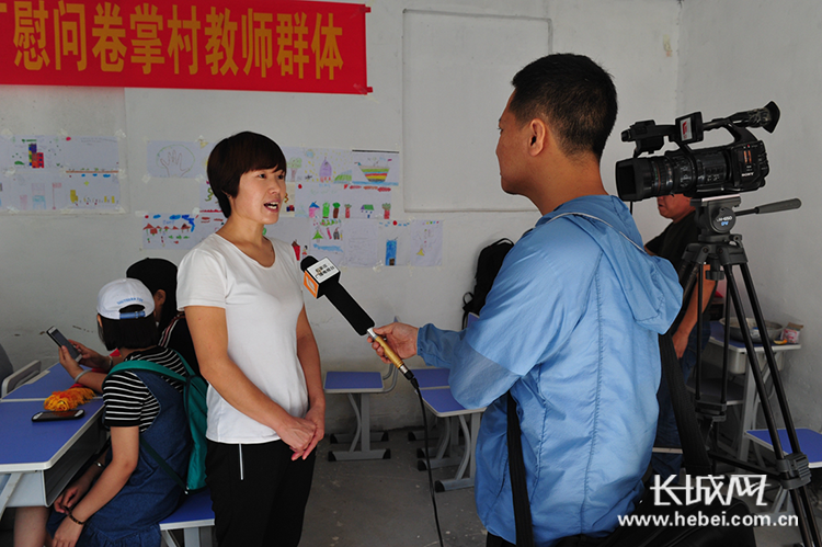李春海老师向前来慰问的人士介绍村里的教师群体。 郭云民 摄