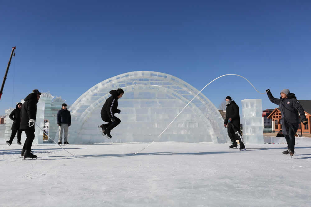 2018年12月24日,几名演员在河北省承德市丰宁满族自治县大滩镇马镇景区排练冰上双人跳绳项目。图片来自视觉中国