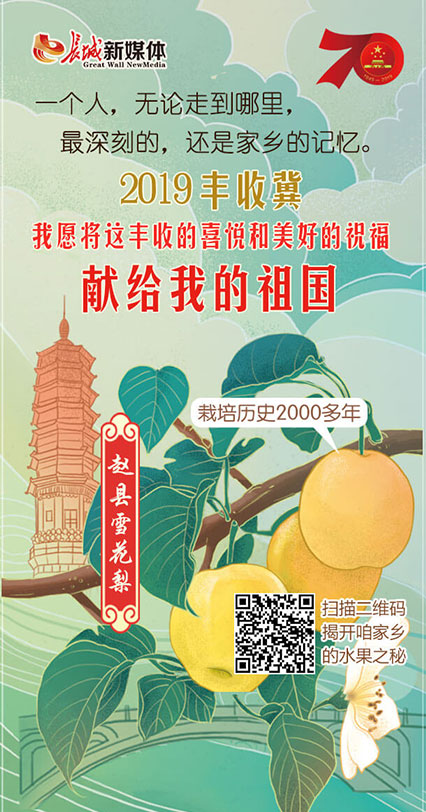 来到石家庄需品尝赵县雪花梨。它与赵州桥齐名。因其果肉细嫩、剖开后似霜如雪而得名。秦汉时期,即为宫廷贡品,历经千年,清香如故。在这个丰收的季节,我愿将这丰收的喜悦和美好的祝福献给我的祖国,庆祝新中国成立70周年。祝愿我的祖国繁荣昌盛、美丽富强。