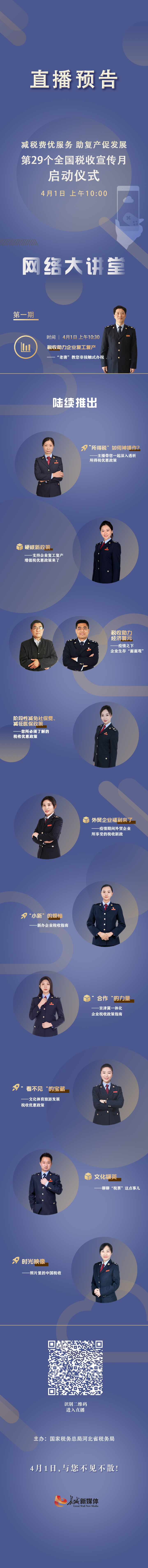长城网讯(陈海虹)4月1日上午10:00,由国家税务总局河北省税务局、长城新媒体集团联合举办的“‘减税费优服务 助复产促发展’暨第29个全国税收宣传月启动仪式”大型网络直播活动将正式开播!活动现场,我们将邀请河北经贸大学财政税务学院教授古建芹、石家庄以岭药业股份有限公司总经理吴相君做客直播间,全方位对税收政策进行深度剖析。同时,还有河北省税务工作人员化身“主播”,以“云课堂”的方式教您“非接触式”办税。期待您的关注!