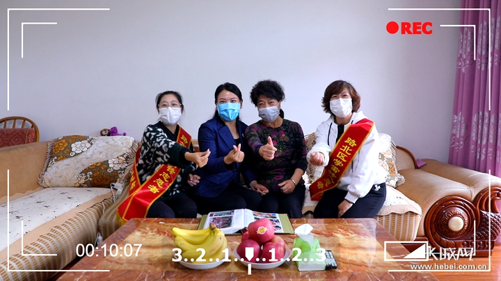 祥富里社区居民王素珍在vlog中与社区工作人员一起赞美生活“忒”幸福。 长城新媒体记者 马宁 摄