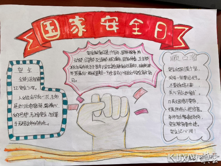随后,老师为同学们上了一堂别开生面的国家安全主题班会,讲述了什么是国家安全、国家安全包含哪些方面、国家安全机关举报受理电话等内容。同学们也通过绘画、手抄报的形式展示了自己对国家安全的理解。