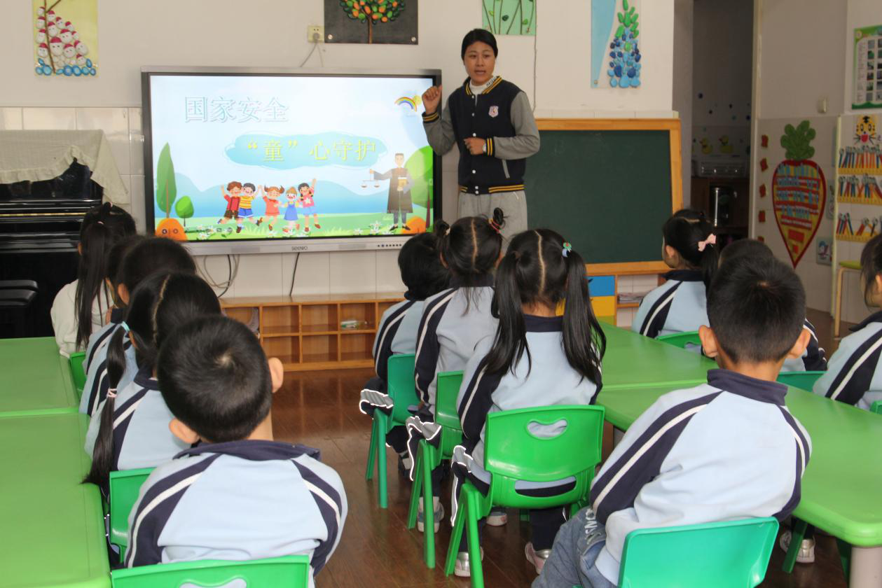在操场上,12名大一班小旗手在全体师生的注目下举行了庄严的升旗仪式。幼儿园负责人就国家安全知识进行了集中宣传普及。随后,各班开展了国家安全主题班会。