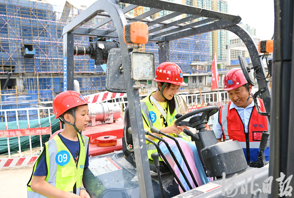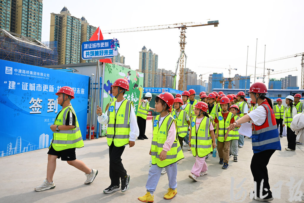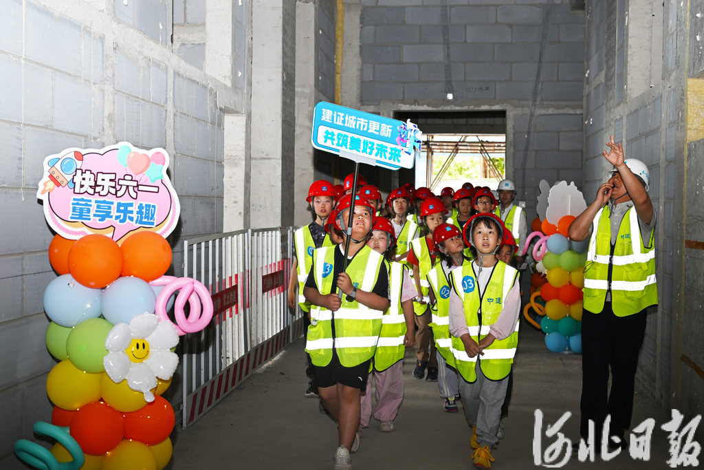 5月25日,小朋友在石家庄市西三教城中村改造配建小学项目工地参观。