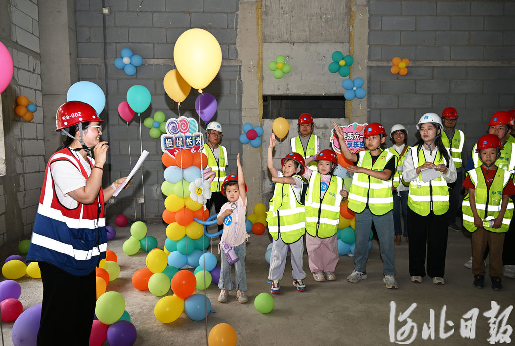 5月25日,在石家庄市西三教城中村改造配建小学项目现场,小朋友参加建筑工地知识抢答竞赛。