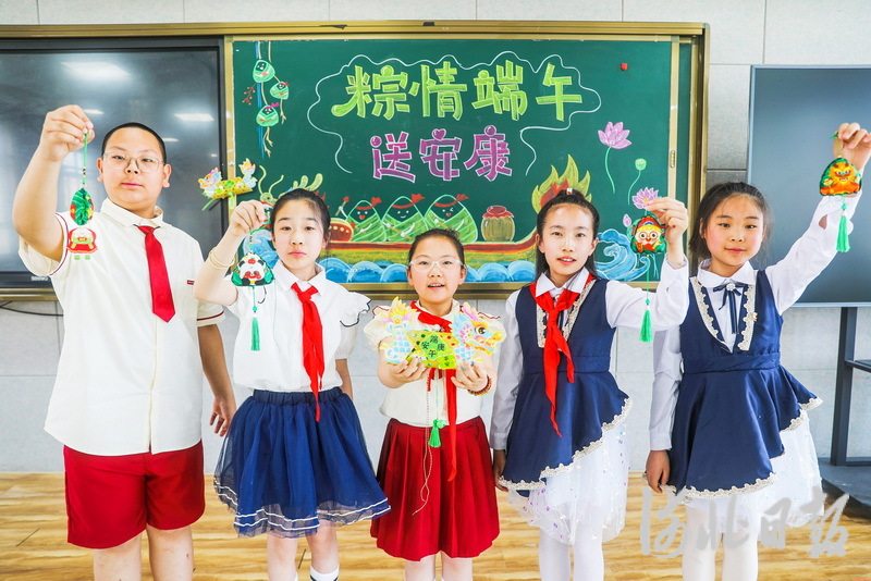 5月26日,张家口市桥东区宝善街小学学生展示制作的香囊和龙舟。