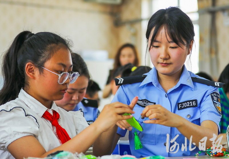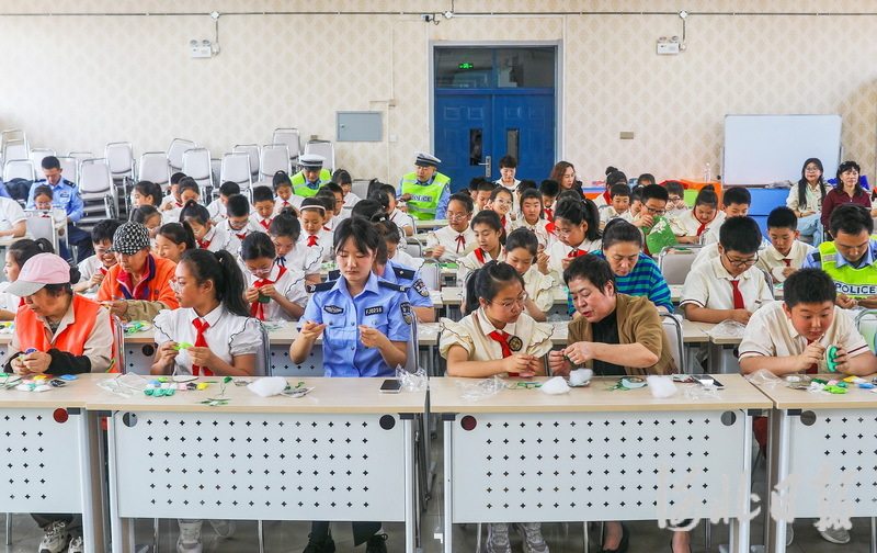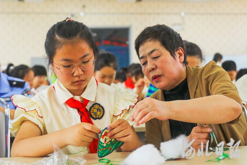 5月26日,张家口市桥东区宝善街小学师生与大家一起缝制香囊。