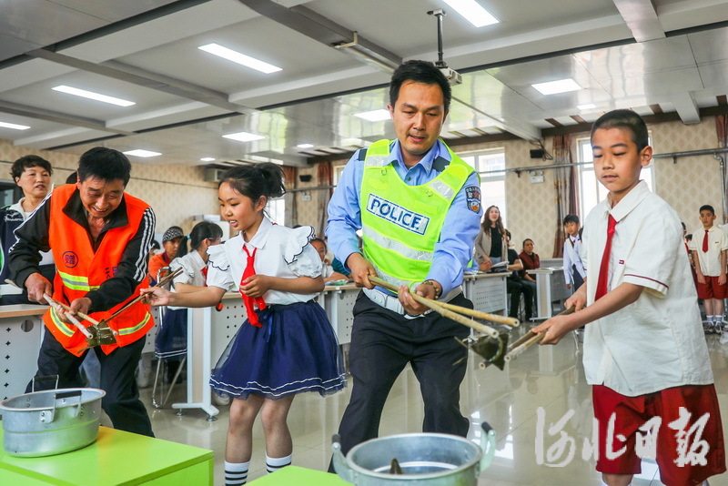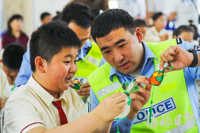 5月26日,张家口市桥东区宝善街小学学生与公安民警、环卫工人一起进行夹粽子游戏。