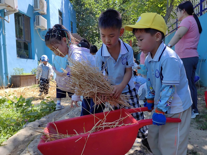 启动仪式结束,幼儿满怀期待地来到初园,分组开启小麦收获之旅。收割组的孩子们手握小剪刀,专注地穿梭在麦田间,小心翼翼地剪下麦穗,放进篮筐;运送组两两配合,推着独轮车,步伐稳健地接力运送收获的麦穗,尽管有些吃力,但脸上始终洋溢着自豪的笑容;晾晒组则早已将大布铺好,大家围在麦穗旁,有的欢快地踩麦穗,有的合力滚动滚筒,还有的用轮胎碾压,用各种创意方法进行脱粒。现场一片热火朝天,孩子们在亲身实践中,真切体验到粮食收获的艰辛与喜悦。