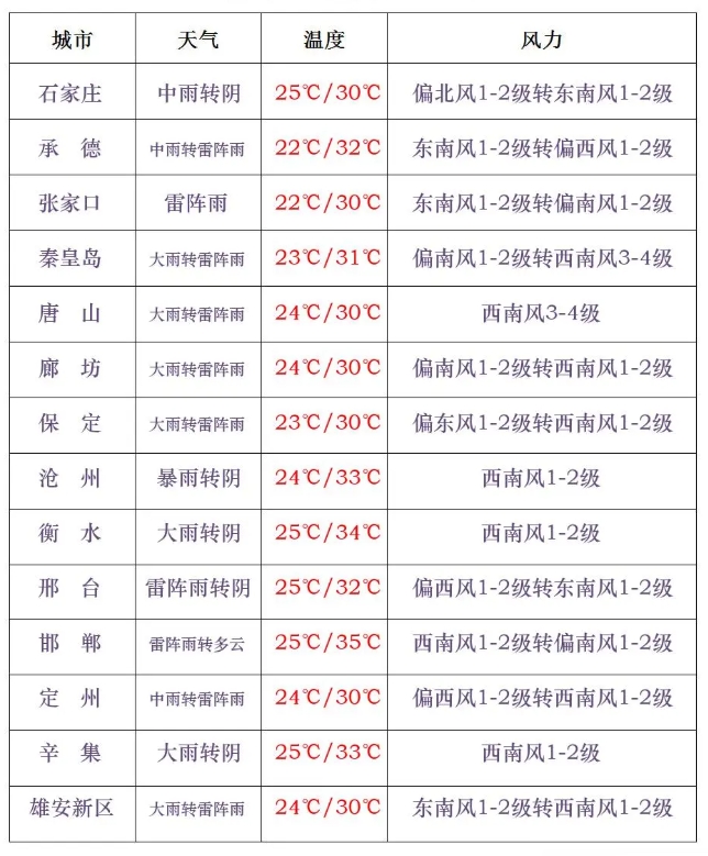 今天白天,石家庄、沧州以北地区阴有分散性雷阵雨或阵雨,其中张家口、承德、唐山北部局地有中到大雨,其他地区多云间阴。