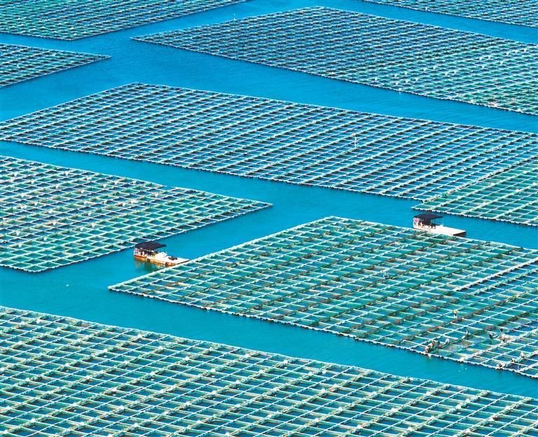 7月13日,渔民在唐山沿海网箱作业区投喂鱼苗,修补养殖网。唐山不断提升海水养殖的环保标准,推动水产养殖产业向绿色低碳转型。赵 亮摄(中经视觉)
