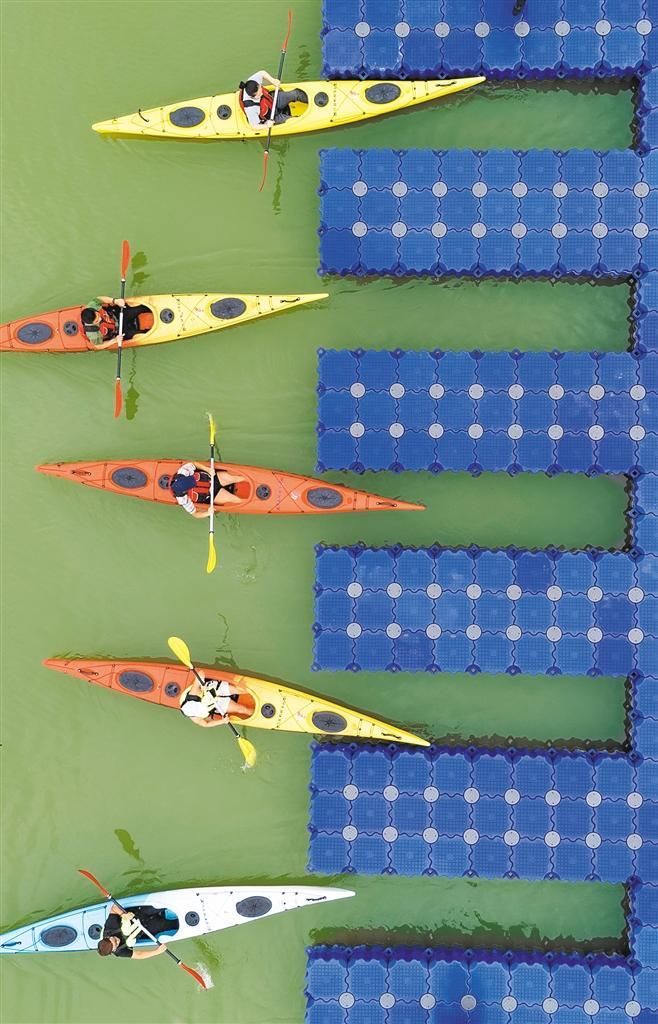 6月27日,市民在唐山迁安滦河左岸体育公园进行皮划艇训练。近年来,当地持续推进滦河生态修复,打造滦河沿岸绿色生态景观带。