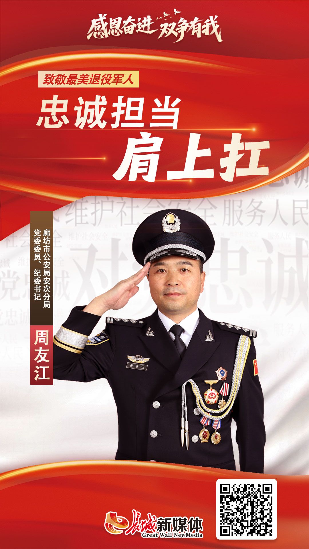 长城网·冀云客户端讯(记者 王笛)从15年军旅生涯的摸爬滚打,到13年从警之路的风雨兼程,廊坊市公安局安次分局党委委员、纪委书记周友江始终带着军人的底色前行。他用“跟我上”的冲锋姿态践行使命,以“办实事”的初心联结民心,在“敢创新”的探索中守护平安——这位退役军人,正以滚烫的忠诚,守护着一方热土的安宁。
