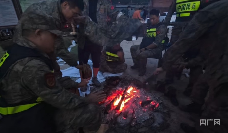 救援队员正烘烤湿透的鞋帽 (央广网记者 王艺霖 摄)