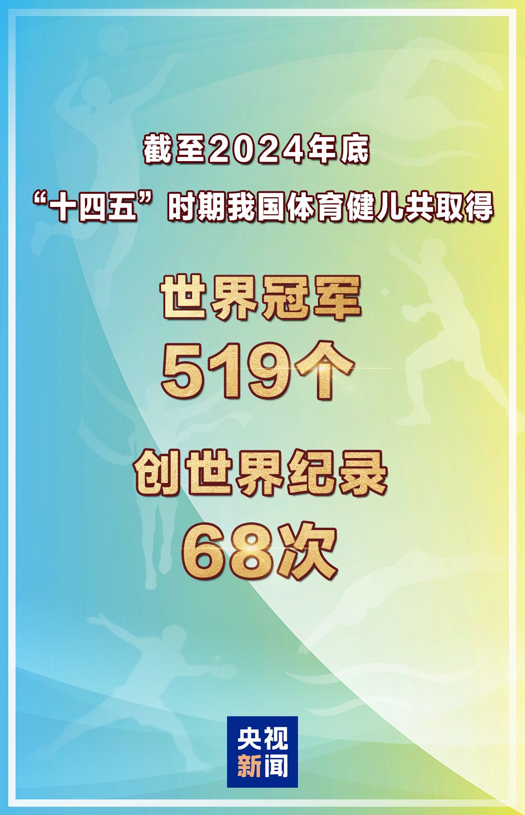 截至2024年底,“十四五”时期我国体育健儿共取得世界冠军519个,创世界纪录68次。