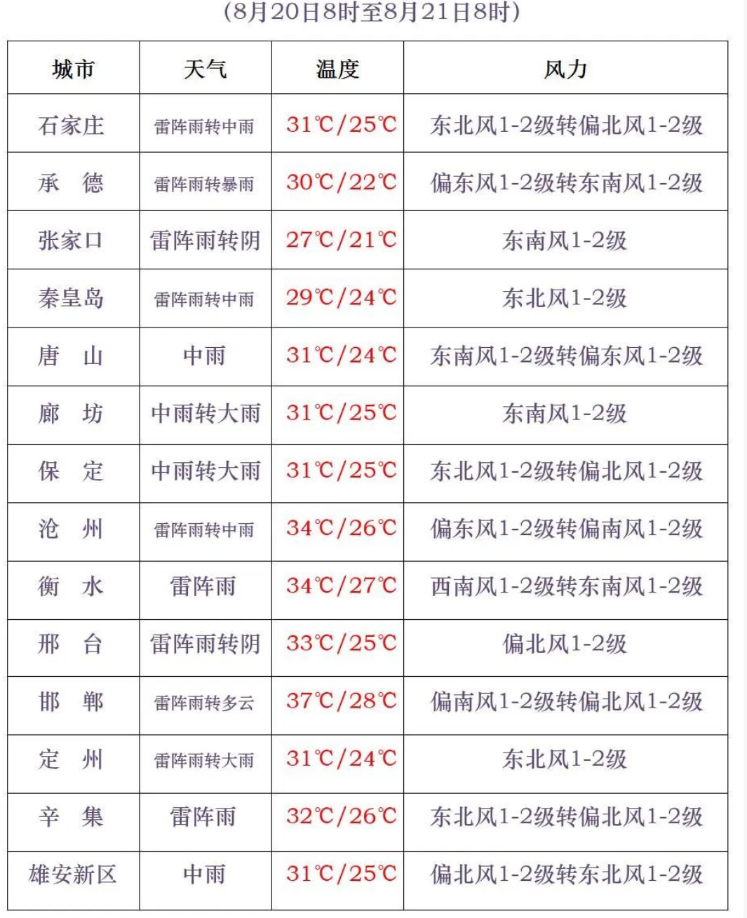 今天白天,石家庄、沧州及以北地区和衡水北部、邢台西部、邯郸西部阴有雷阵雨或阵雨,其中承德南部、唐山北部、保定东部和西部、雄安新区、廊坊、石家庄西部、沧州北部有中到大雨,个别地点有暴雨,降雨时局地伴有雷电、短时强降水、短时大风等强对流天气,其他地区多云。