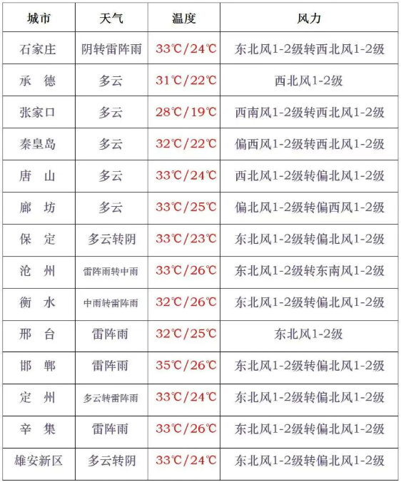 今天白天,石家庄南部、沧州、衡水、邢台、邯郸阴有雷阵雨或阵雨,局地有中雨,其他地区多云。