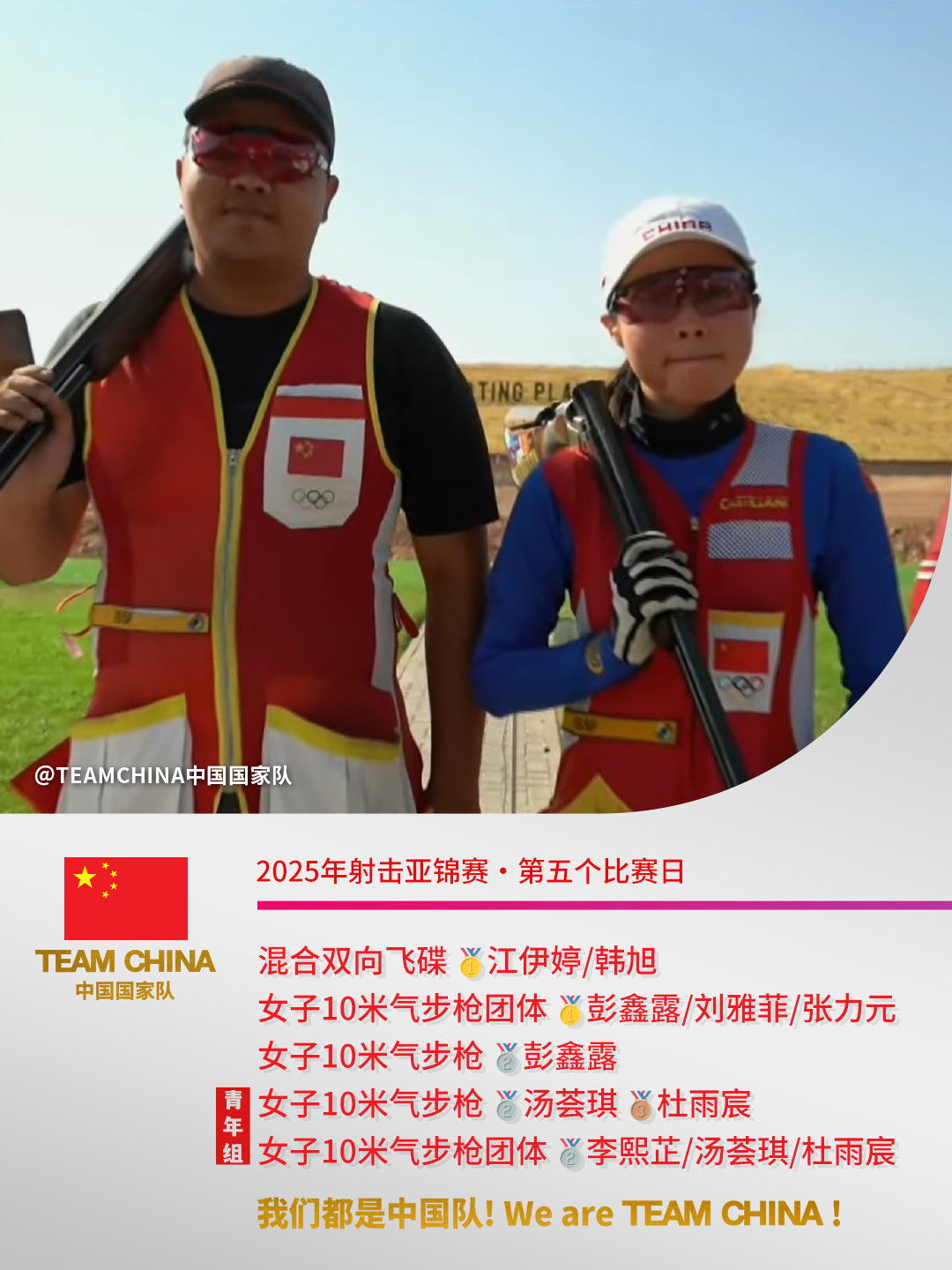 第16届亚洲射击锦标赛在哈萨克斯坦奇姆肯特继续进行。第五个比赛日,中国队收获2金3银1铜,其中由刘雅菲、彭鑫露、张力元组成的中国女队以1902.0环的总成绩刷新了10米气步枪女子团体世界纪录、亚洲纪录。