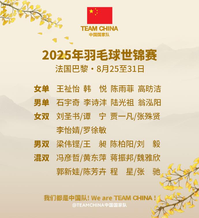 8月22日,中国羽毛球队从北京飞往巴黎,参加2025年羽毛球世锦赛。8月25日至31日,本次比赛将在巴黎拉夏贝尔门体育馆进行。国羽一共有8位单打选手和9对双打组合共26人参加2025年巴黎世锦赛。
