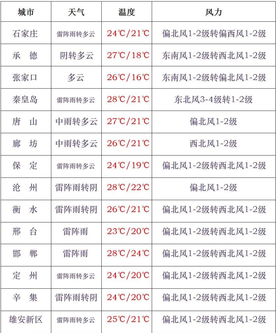 今天白天,承德南部、唐山、秦皇岛和保定、廊坊及以南的大部分地区多云间阴有雷阵雨或阵雨,个别地点有中到大雨,其他地区多云。