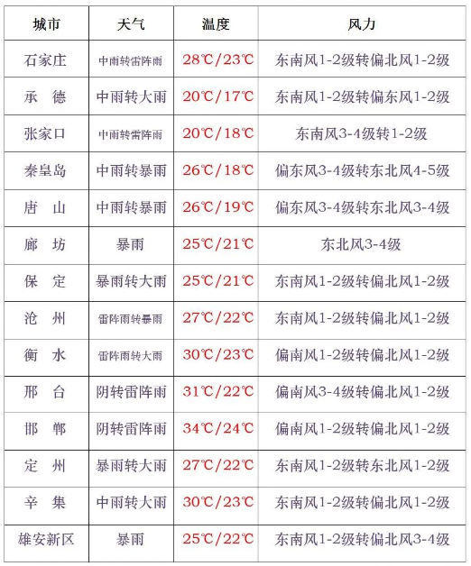 今天白天,全省阴,石家庄、沧州及以北地区有中到大雨,其中张家口东部、承德西部、保定中东部、雄安新区、廊坊南部部分地区有暴雨,局地有大暴雨,其他地区有雷阵雨或阵雨。雷雨时局地伴有短时强降水、短时大风等强对流天气。