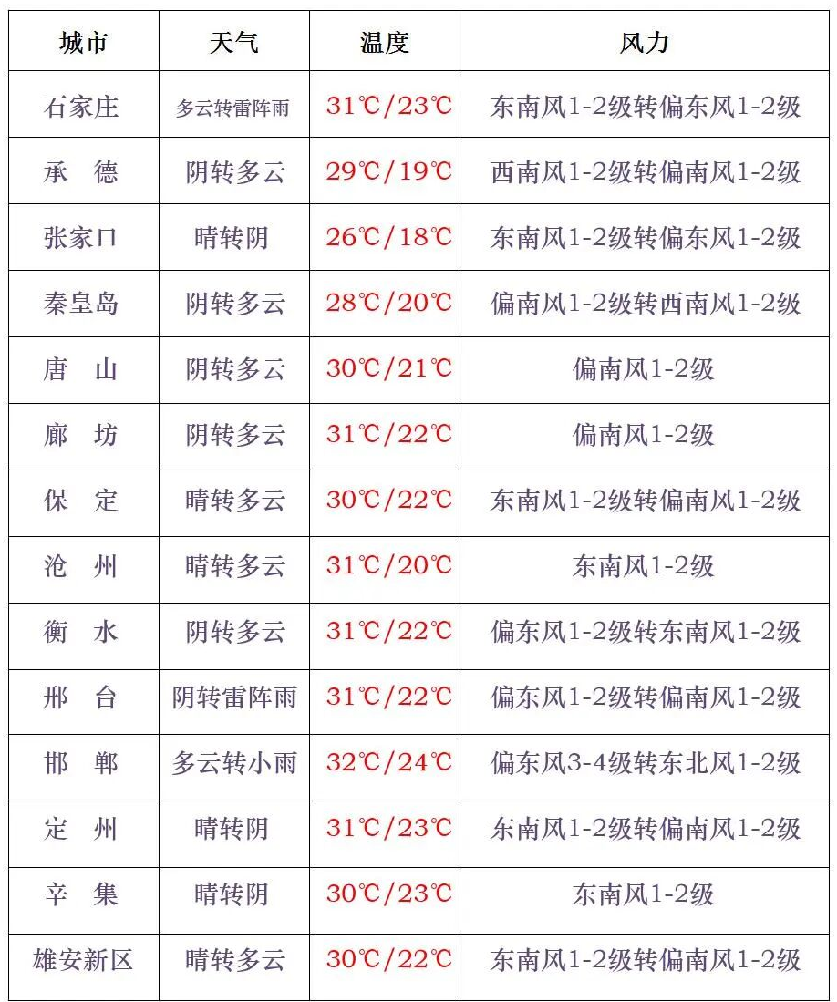 今天白天,保定、廊坊以北地区和邢台南部、邯郸多云间阴有分散性雷阵雨或阵雨,其他地区晴间多云。