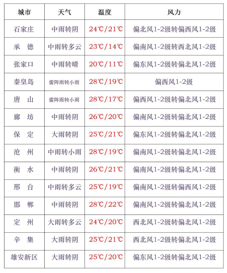 今天白天,全省阴,张家口东部、承德西部和保定、廊坊及以南地区有中雨,局地大雨,个别地点有暴雨,其他地区有雷阵雨或阵雨。