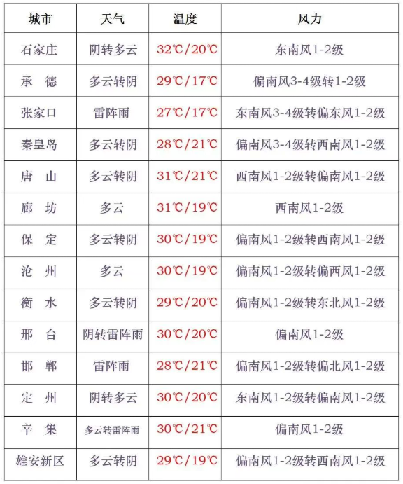 今天白天,张家口、承德西部、保定西部、石家庄西部、邢台西部、邯郸多云转阴有雷阵雨或阵雨,其中邯郸南部局地有中到大雨;其他地区多云。