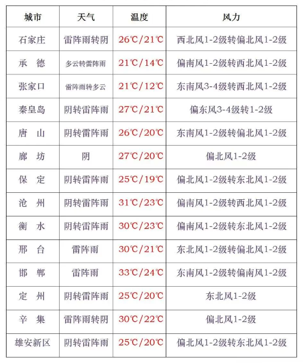 今天白天,张家口、承德、保定西部、石家庄、衡水南部、邢台、邯郸阴有雷阵雨或阵雨,局地有中雨,其他地区多云。