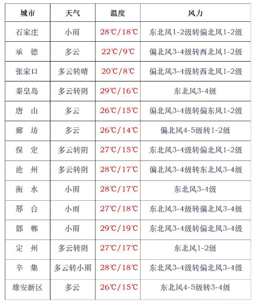 今天白天,保定、廊坊及以南地区阴有小雨或阵雨,其中邢台东部、邯郸东部局地有中雨,其他地区多云间晴。