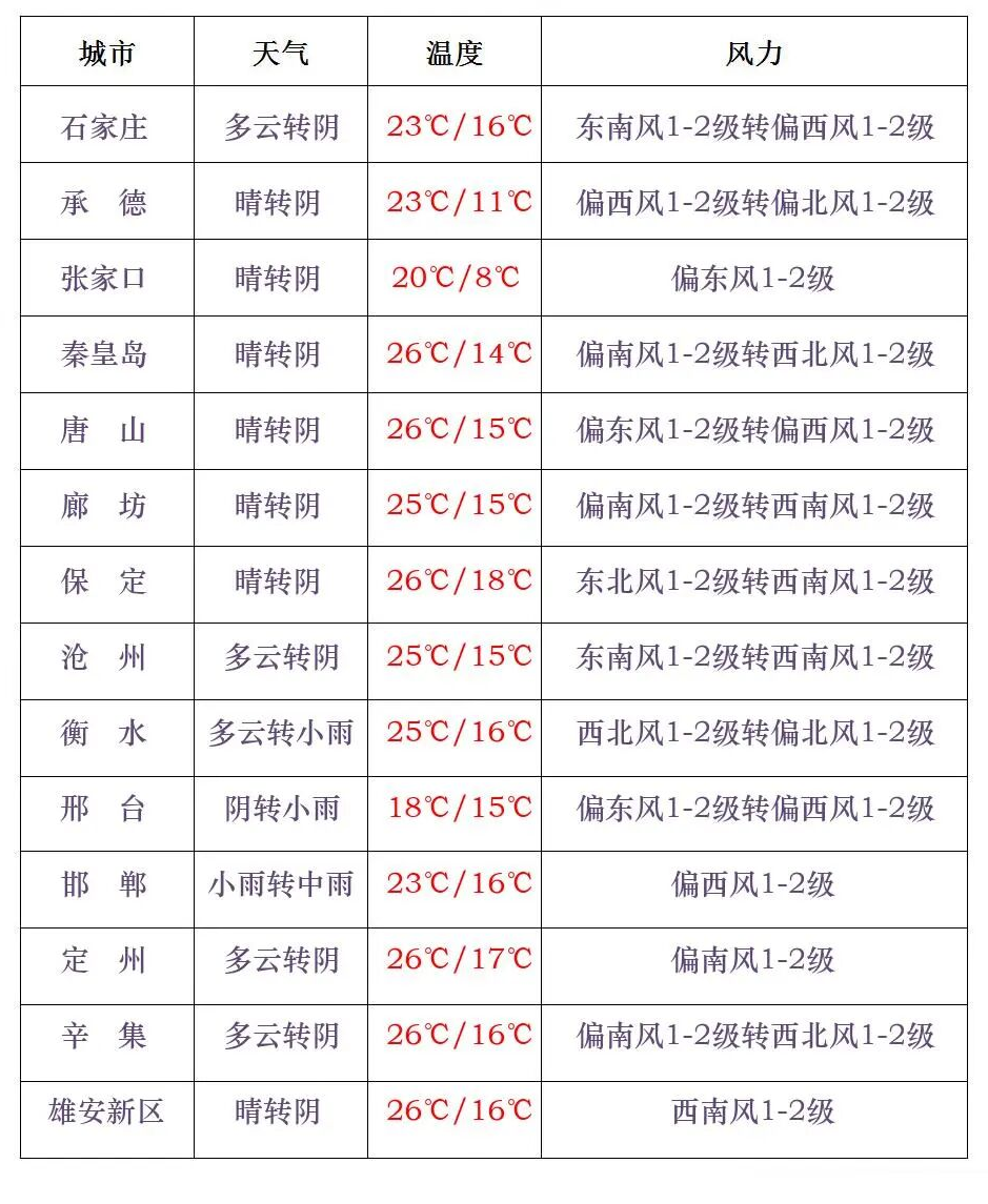 今天白天,石家庄、沧州及以南地区晴转多云,其中邯郸多云转阴有零星小雨,其他地区晴间多云。
