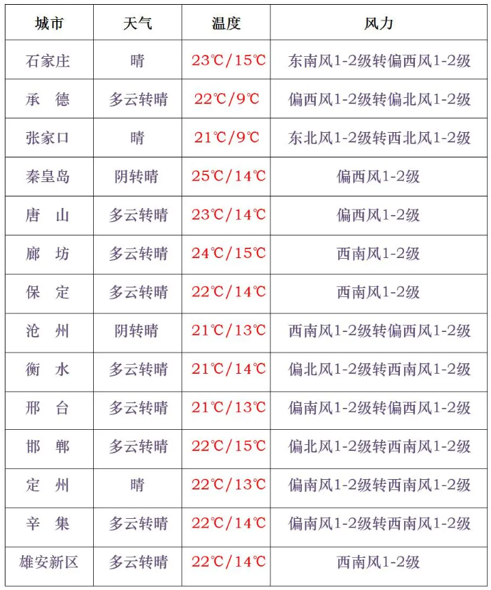 今天白天,全省晴间多云。今天夜间到21日,张家口、保定西部、石家庄西部、邢台西部、邯郸晴转多云间阴,其中邯郸西南部有小雨或零星小雨,其他地区晴间多云。