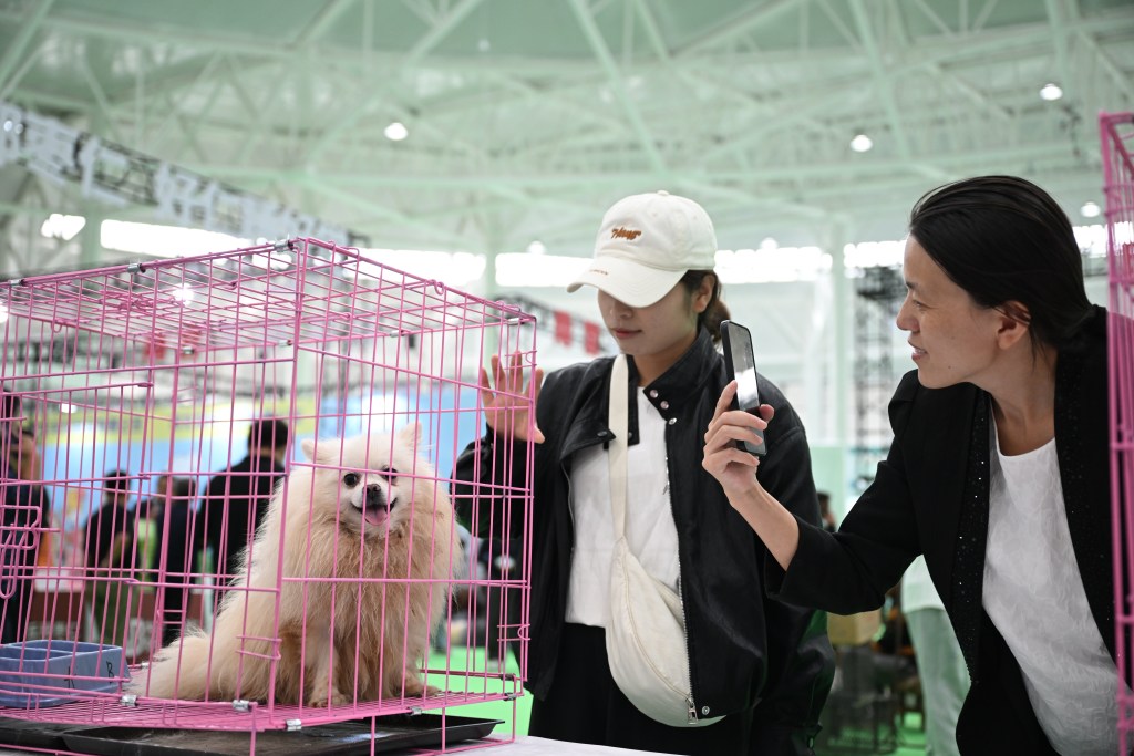 9月19日,观众在第七届中国・南和宠物产业博览会暨第二届宠物产业国际链博会上给宠物狗拍照。