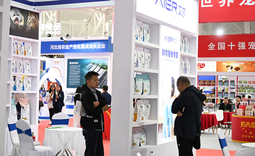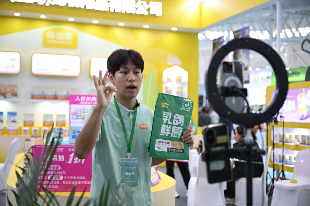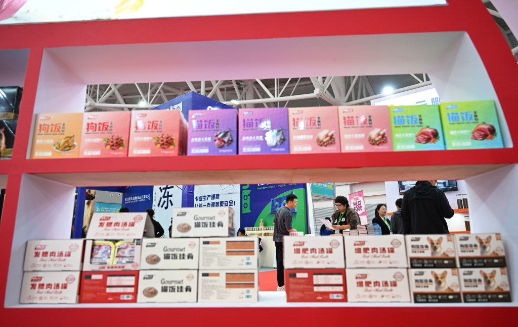 9月19日,参展商在第七届中国・南和宠物产业博览会暨第二届宠物产业国际链博会上网售宠物食品。