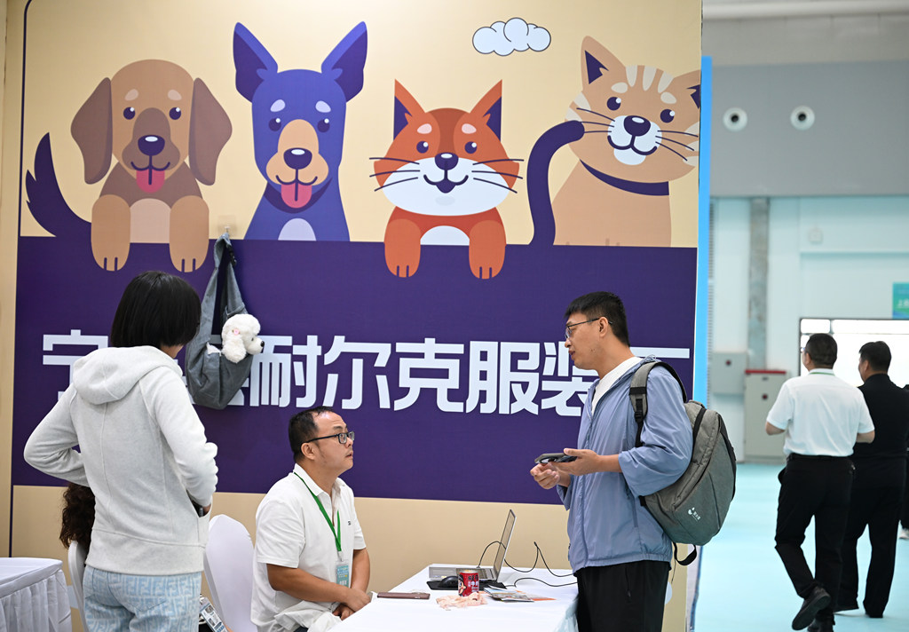 9月19日,观众在第七届中国・南和宠物产业博览会暨第二届宠物产业国际链博会上与宠物用品参展商洽谈。