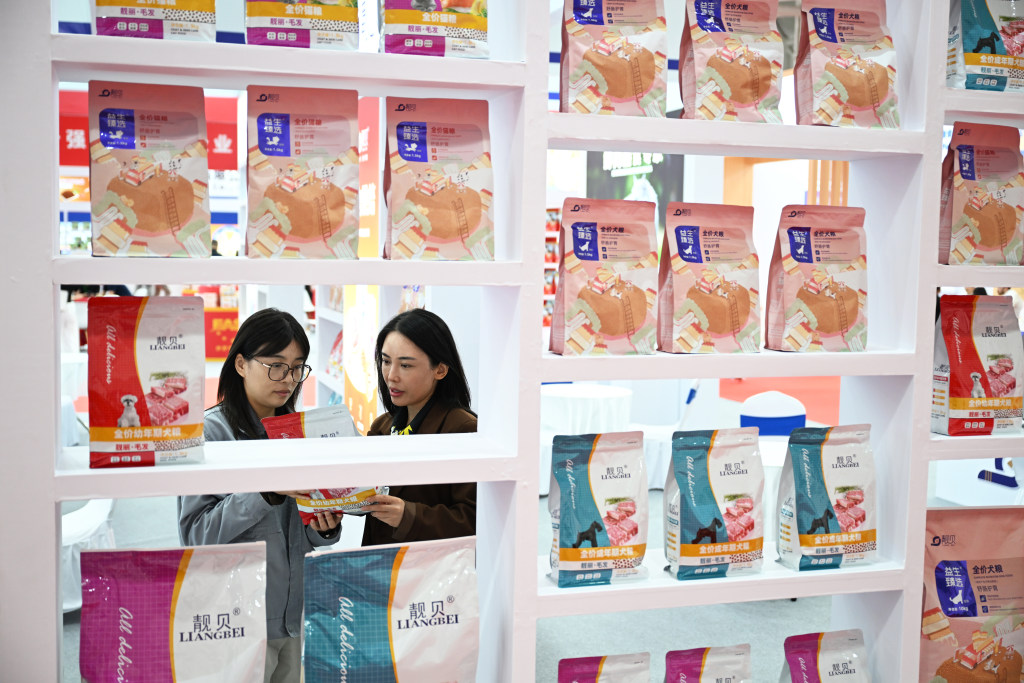 9月19日,观众在第七届中国・南和宠物产业博览会暨第二届宠物产业国际链博会上选购宠物食品。