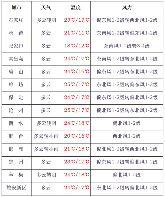 今天白天,张家口北部、承德北部多云间阴有小雨或零星小雨,邯郸南部阴有小雨或零星小雨转多云,其他地区多云。