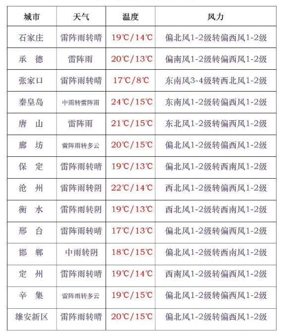 今天白天,唐山中东部、秦皇岛、沧州东部、衡水东部、邢台东部、邯郸中东部多云转阴有中雨,其他地区阴有小雨。