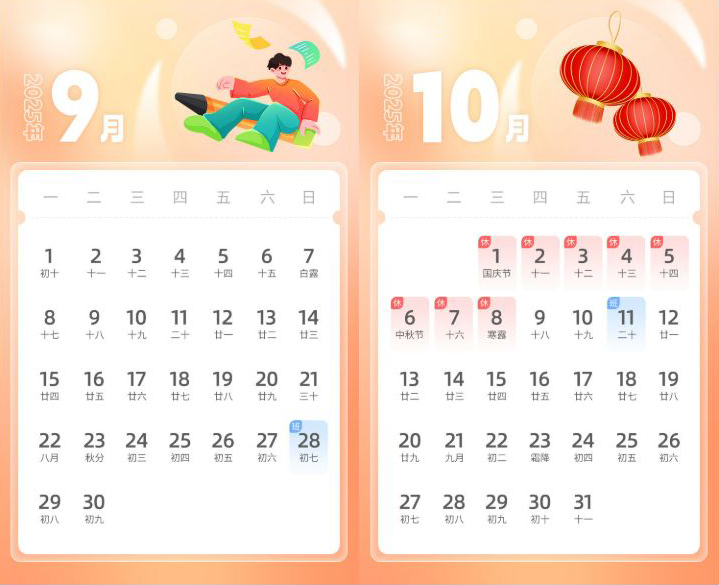 2025年国庆中秋假期快要到来,请注意,本周上班时间有变!9月28日(周日)正常上班,10月1日(周三)至8日(周三)放假调休。