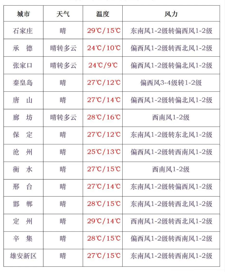 今天白天,全省晴间多云。张家口、承德中北部有西到西北风4到5级,阵风6到7级,局地8级以上。