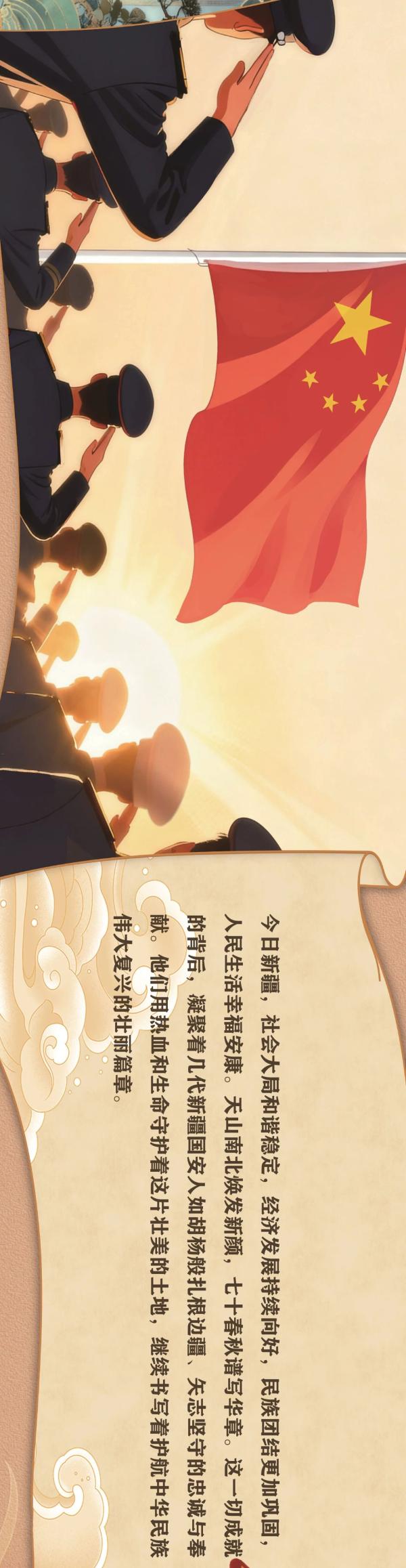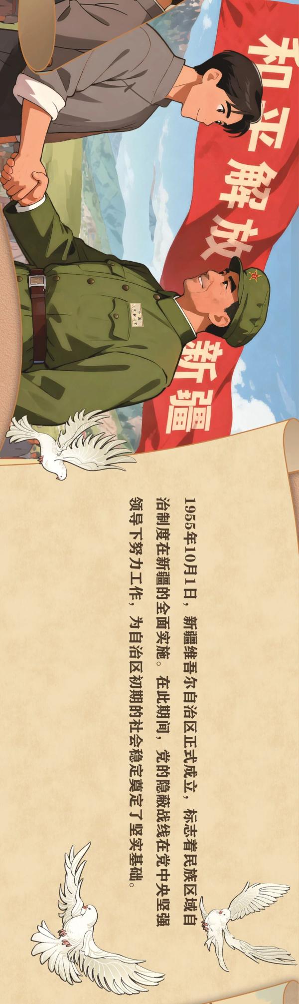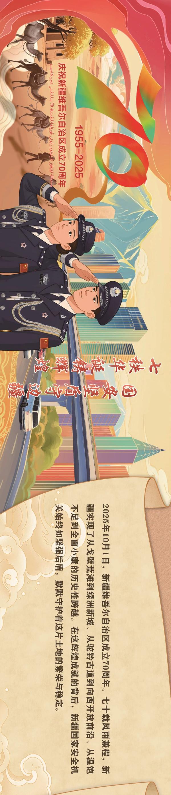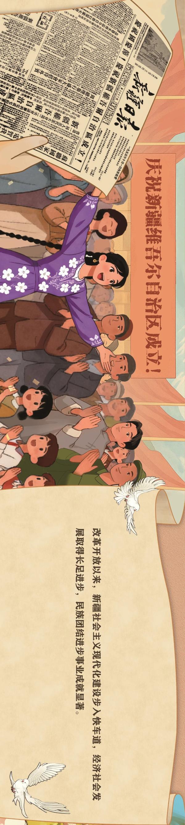 七十载栉风沐雨,七十载昂首奋进。1955年10月1日,新疆维吾尔自治区宣告成立,这是新疆发展史上具有里程碑意义的大事,是中国共产党民族政策的又一伟大胜利。为尽快改变贫穷落后面貌,在中国共产党领导下,新疆各族人民自力更生、奋发图强,全国人民心系边疆、倾力支援,新疆工业体系初步建立,农业生产条件显著改变,教育、科学、卫生、交通、水利事业有很大发展,实现从百废待兴到欣欣向荣的历史性跨越,取得社会主义革命和建设的伟大成就,创造了“敢教日月换新天”的人间奇迹。
