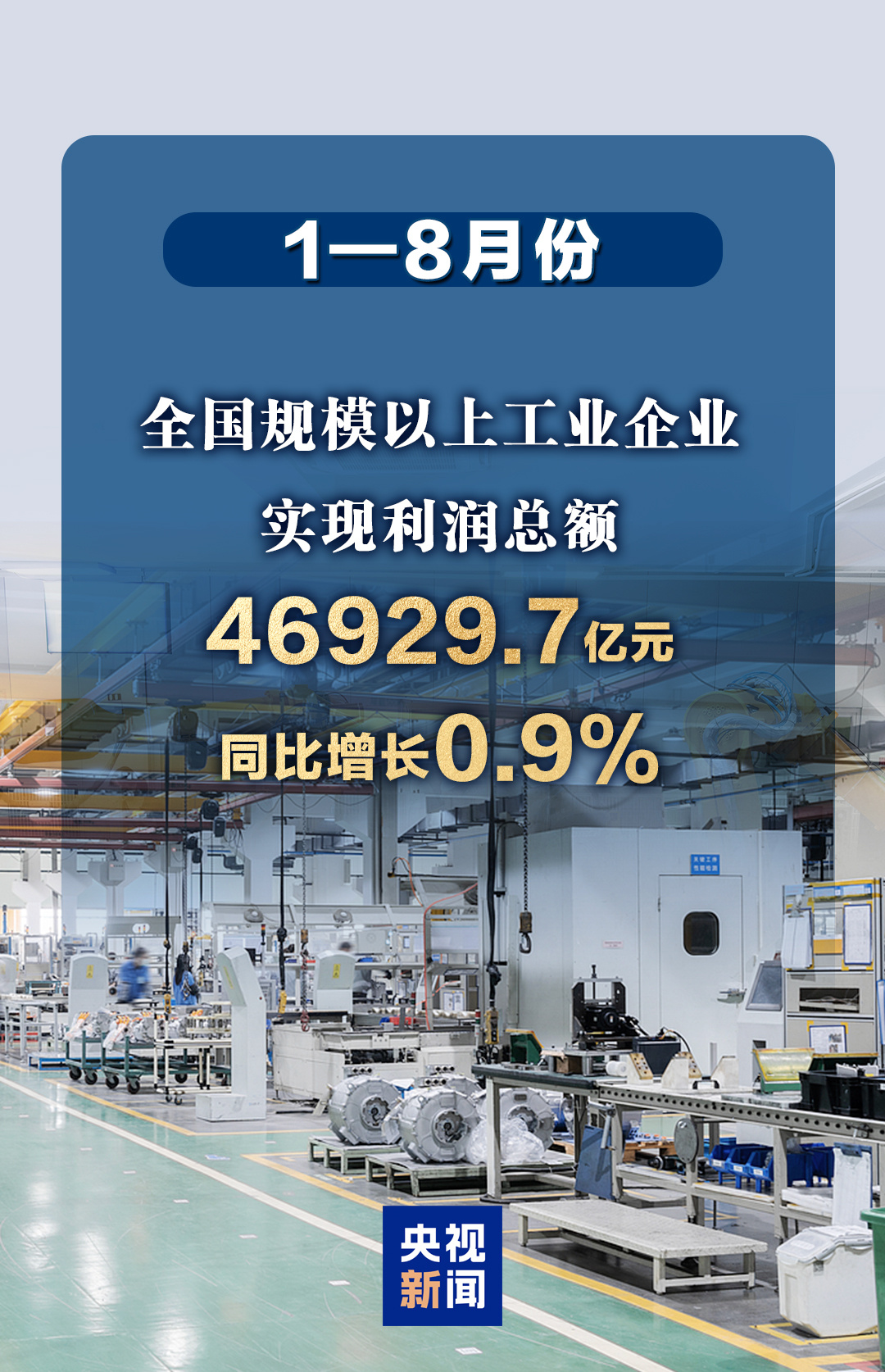 据国家统计局消息,1—8月份,全国规模以上工业企业实现利润总额46929.7亿元,同比增长0.9%。