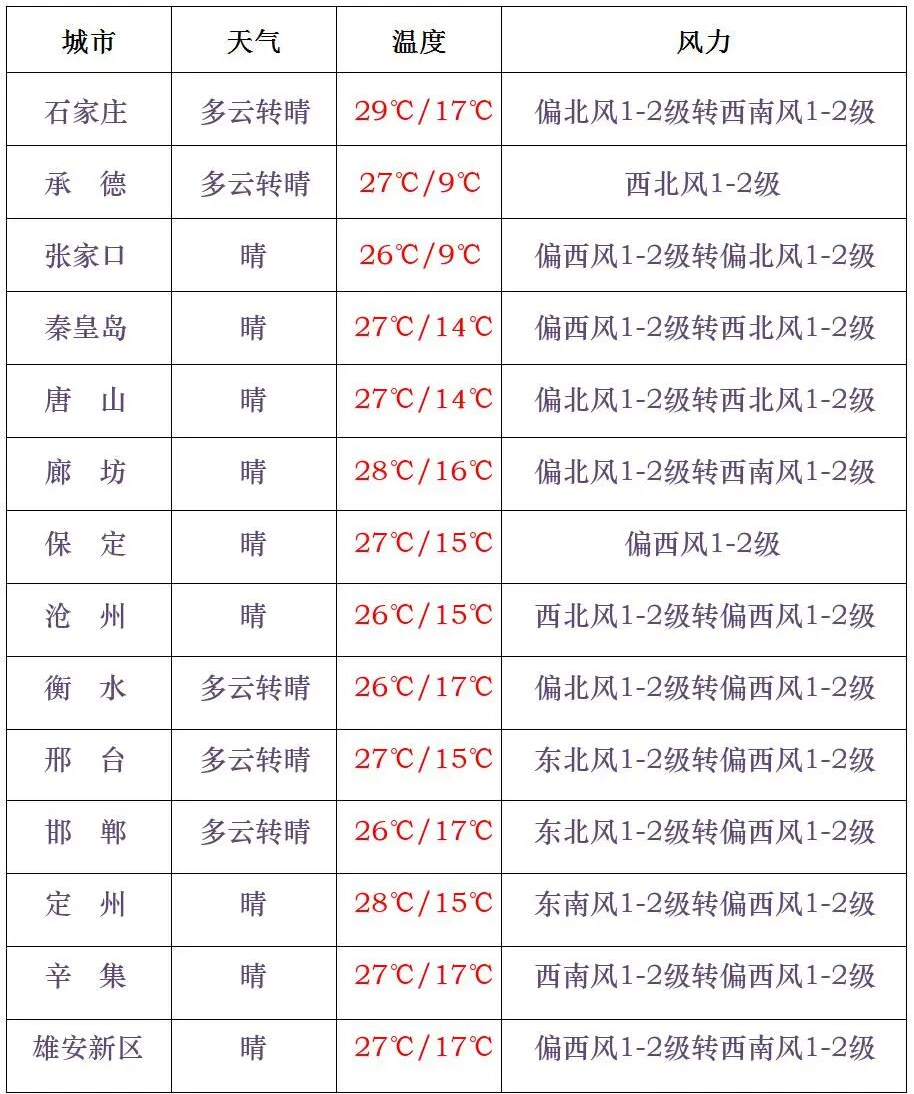 今天白天,全省多云转晴。今天夜间到29日,张家口、承德、保定西北部晴转多云,其他地区晴间多云。